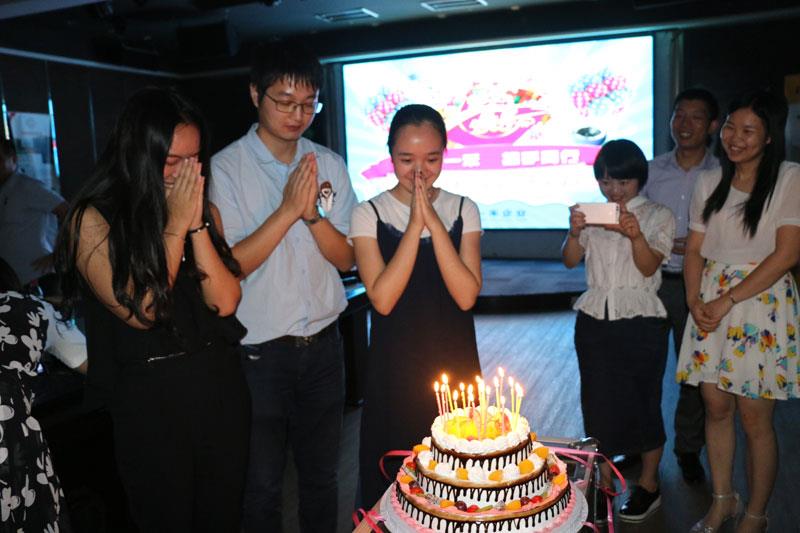 隨著生日歌的響起,燈光熄滅,生日蛋糕映入眼簾,大家為壽星公們送上最誠摯的祝福。眾星捧月的壽星公們默默許下各自的愿望,相信心誠則靈,愿望一定可以實(shí)現(xiàn)。最后,陳董為壽星公們送上公司精心準(zhǔn)備的生日禮物。